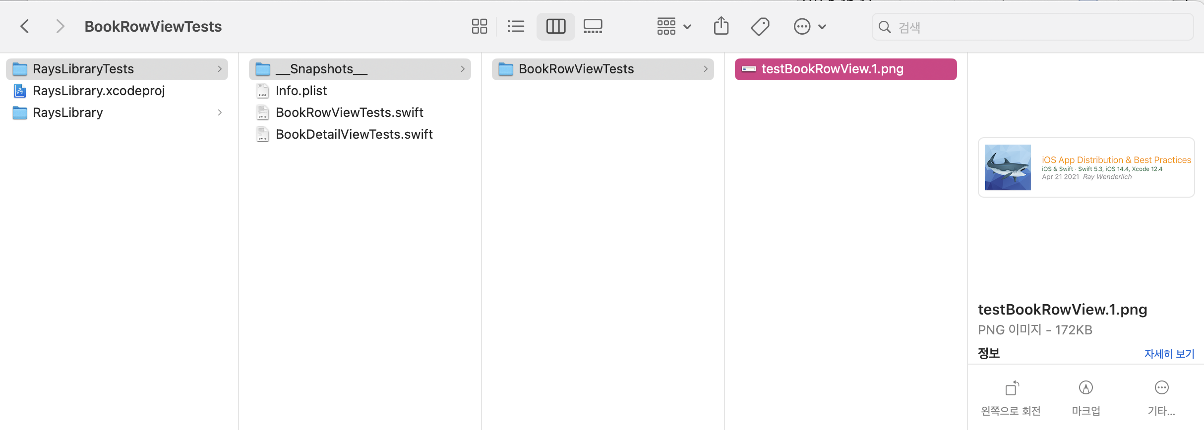 /// Testing for Dark Mode func testBookDetailViewOniPhoneDarkMode() throws { let traitDarkMode = UITraitCollection(userInterfaceStyle: .dark) assertSnapshot( matching: viewController, as: .image(on: .iPhoneX, traits: traitDarkMode) ) }ํ ์คํธ๊ฐ ๋ชจ๋ ์ฑ๊ณตํ๊ณ , ์ค๋ ์ท์ด ์ ์ฅ๋ ๊ฒ ํ์ธ ๊ฐ๋ฅ!