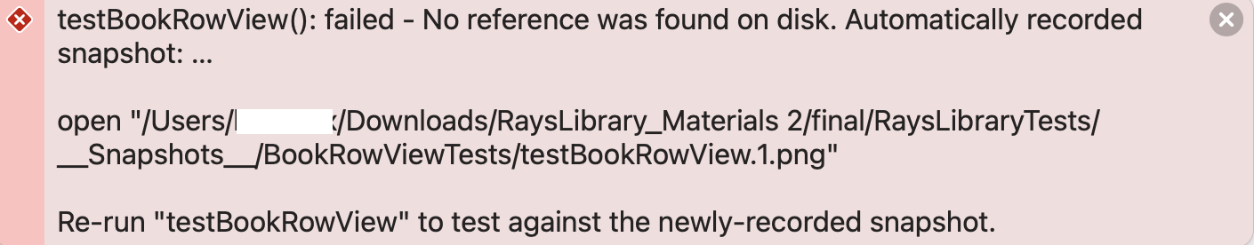 ์ฝ๋๋ฅผ ์คํํ๋ฉด, ํ ์คํธ๋ ์คํจํ์ง๋ง SnapshotTesting์ ํ ์คํธ๋ฅผ ์ฒ์ ์คํํ์ ๋์ ๋ง์ฐฌ๊ฐ์ง๋ก ์๋ก์ด ๊ธฐ์ค ์ค๋ ์ท์ ์ ์ฅํฉ๋๋ค.