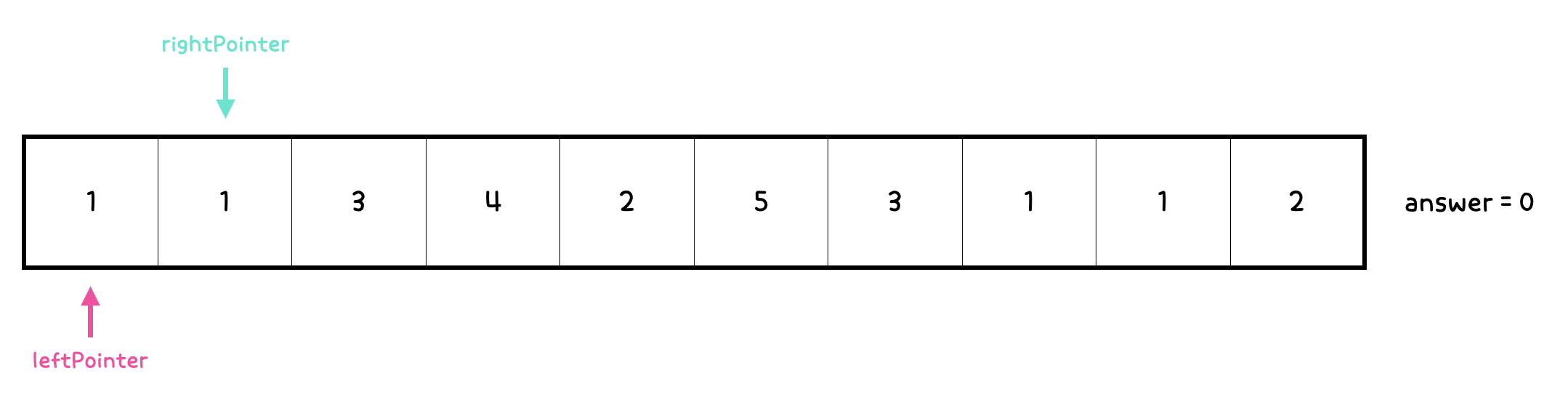 1. 초기 상태, leftPointer의 인덱스 = 0, rightPointer의 인덱스 = 0