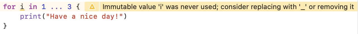 ์๋ ์ฝ๋๋ print๋ฌธ์ 3๋ฒ ์ถ๋ ฅํ๋ ์ฝ๋์ธ๋ฐ, ๊ฒฝ๊ณ ๋ฉ์์ง๋ฅผ ์ฝ์ด๋ณด๋ฉด ๋ฐ๋ณต ์์ i๋ ์ฌ์ฉ๋์ง ์๊ธฐ ๋๋ฌธ์ ์ด๋ฅผ ๋์ฒดํ๊ฑฐ๋ '_' ๋ฅผ ์ฌ์ฉํ๋ผ๊ณ ํ๋ค.