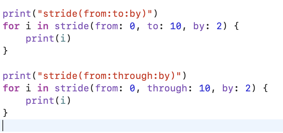 stride(from:to:by)์ ๋ฒ์๋ from ~ (to -1)์ด์ง๋ง, stride(from:through:by)์ ๋ฒ์๋ from ~ through ๋ผ๋ ๊ฒ์ ์์๋์!