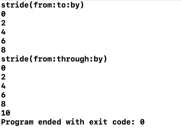 ์คํ๊ฒฐ๊ณผ for-in stride ๋ฌธ์ ํฌ๊ฒ stride(from:to:by)์ stride(from:through:by)์ 2๊ฐ์ง๋ก ๋๋ ์ ์๋ค.