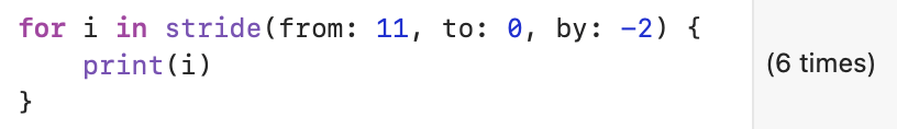 ๊ทธ๋ฆฌ๊ณ for-in stride๋ฌธ์์๋ ReversedCollection์ ์ฌ์ฉํ์ง ์๊ณ ๋ ๋ฒ์๋ฅผ ๋ด๋ฆผ์ฐจ์์ผ๋ก ๋ํ๋ผ ์ ์๋๋ฐ,