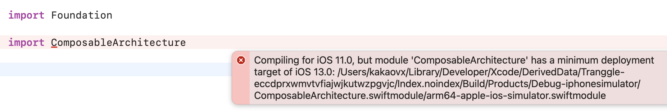 Compiling for iOS 11.0, but module 'ComposableArchitecture' has a minimum deployment target of iOS 13.0: /Users/Name/Library/Developer/Xcode/DerivedData/~/Index.noindex/Build/Products/Debug-iphonesimulator/ComposableArchitecture.swiftmodule/arm64-apple-ios-simulator.swiftmodule