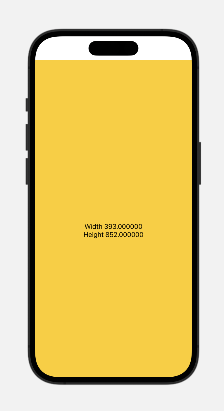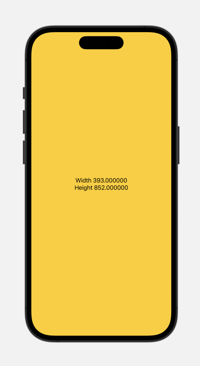 struct ContentView: View { var body: some View { GeometryReader { geometry in ZStack { Color .yellow .frame( width: geometry.size.width, height: geometry.size.height ) VStack { Text("Width \(geometry.size.width)") Text("Height \(geometry.size.height)") } } } .edgesIgnoringSafeArea(.all) } }