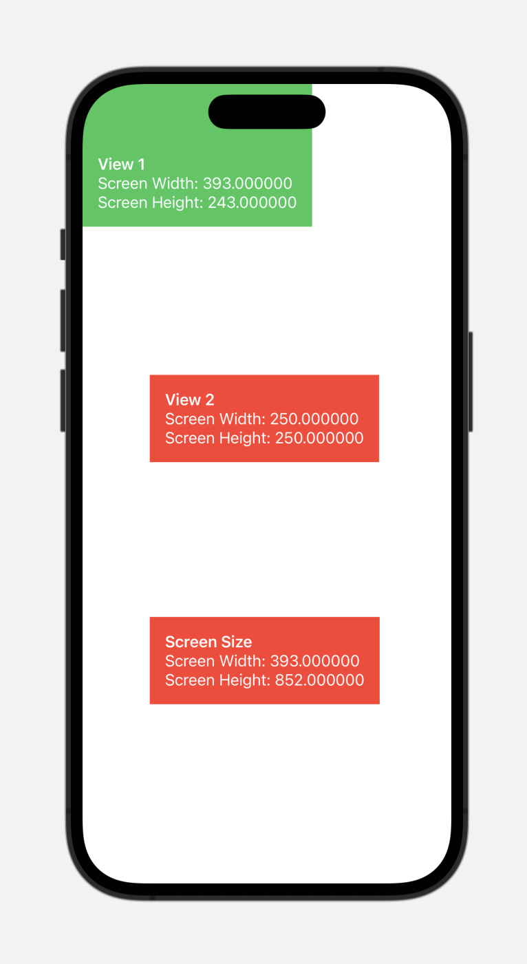 import SwiftUI struct ContentView: View { var body: some View { VStack { VStack { GeometryReader {geometry in VStack (alignment: .leading){ Text("View 1").bold() Text("Screen Width: \(geometry.size.width)") Text("Screen Height: \(geometry.size.height)") } .padding() .background(Color.green) .foregroundColor(Color.white) } } VStack { GeometryReader {geometry in VStack (alignment: .leading){ Text("View 2").bold() Text("Screen Width: \(geometry.size.width)") Text("Screen Height: \(geometry.size.height)") } .padding() .background(Color.red) .foregroundColor(Color.white) } } .frame(width: 250, height: 250) VStack { let screenSize = UIScreen.main.bounds.size GeometryReader {geometry in VStack (alignment: .leading){ Text("Screen Size").bold() Text("Screen Width: \(screenSize.width)") Text("Screen Height: \(screenSize.height)") } .padding() .background(Color.red) .foregroundColor(Color.white) } } .frame(width: 250, height: 250) } } } struct ContenttView_Previews: PreviewProvider { static var previews: some View { ContentView() } }