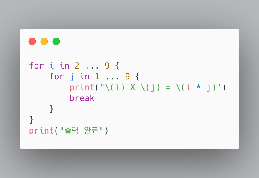 ๊ฒฐ๋ก ์ ์ผ๋ก ๊ตฌ๊ตฌ๋จ์ด 2๋จ๋ถํฐ 9๋จ๊น์ง ์ฒซ๋ฒ์งธ ๊ฒฐ๊ณผ๋ง ์ถ๋ ฅ๋๊ณ , ์ด์ด์ง๋ ๋ฌธ์ฅ์ธ "์ถ๋ ฅ ์๋ฃ"๊ฐ ์คํ๋๋ค.
