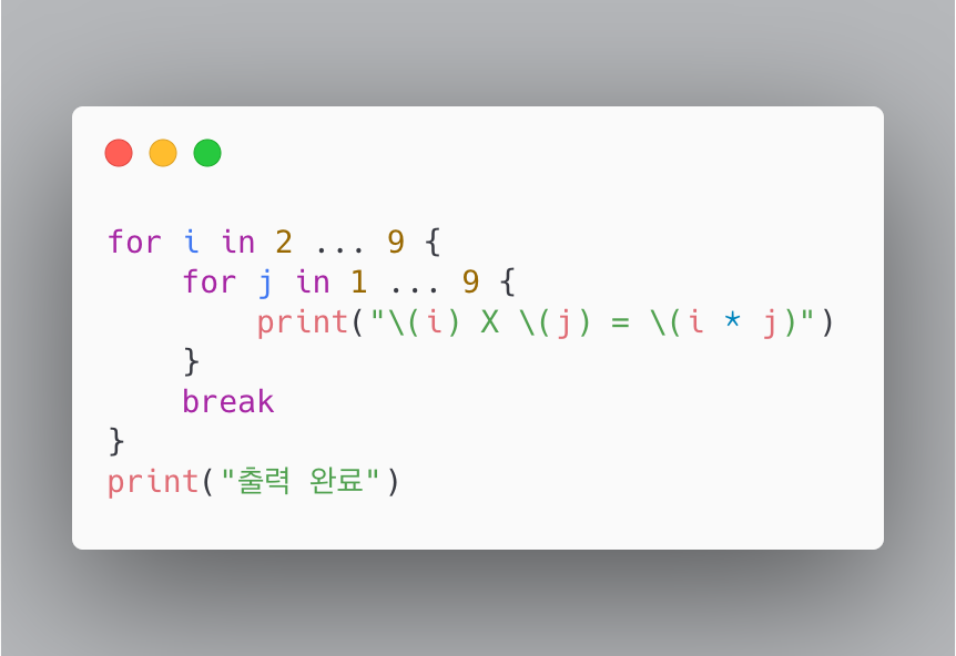 i = 2์ผ ๋ j = 1 ~ 9๋ฅผ ๋ฐ๋ณตํ๊ณ ๋๋ฉด, i = 3์ด ์คํ๋์ง ์๊ณ ๋ฐ๋ก for ๋ฌธ์ด ์ข ๋ฃ๋๋ ๊ฒ์ด๋ค.