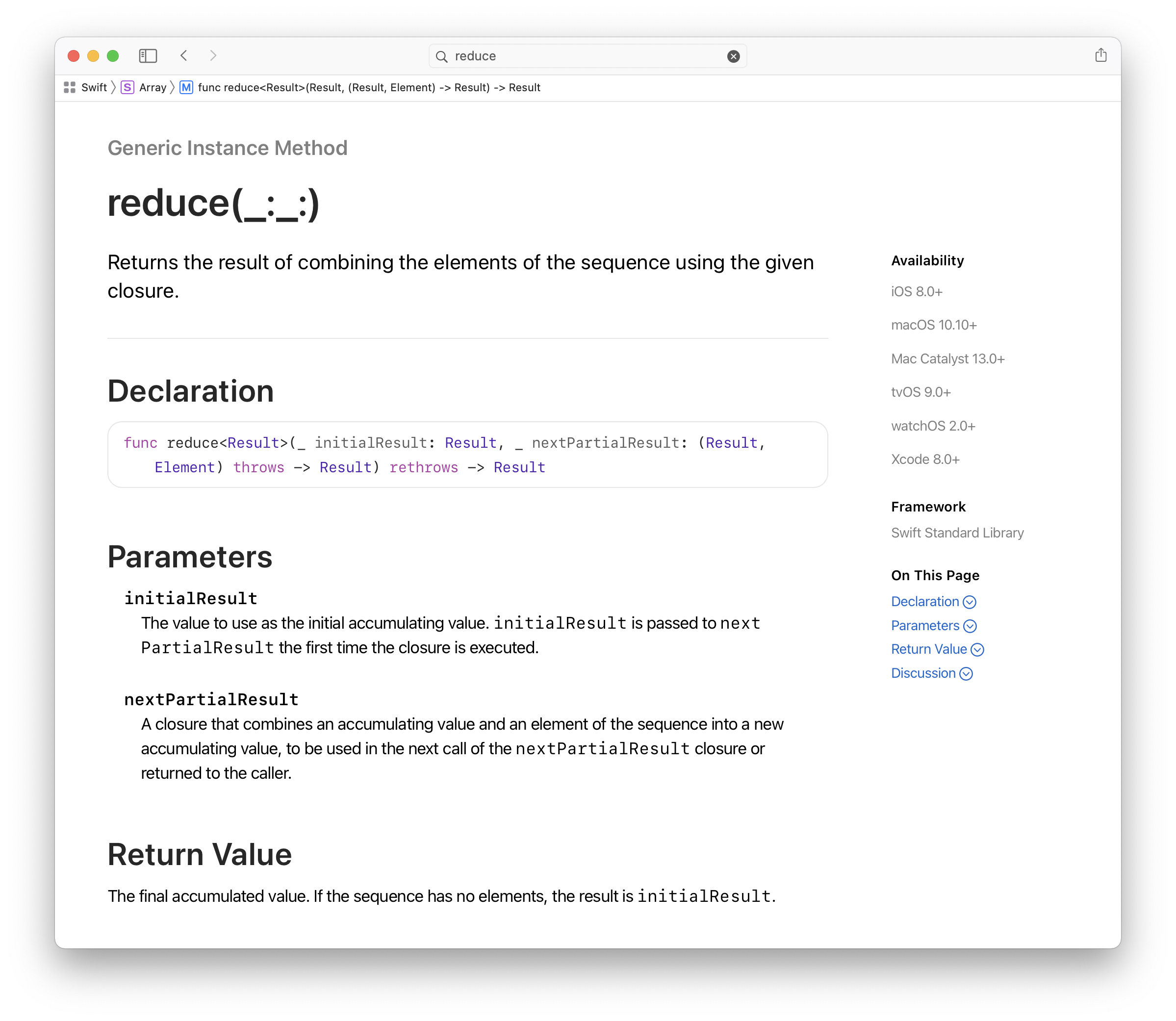 reduce(_:_:) ๋ฉ์๋๋ ์ ์ฒด ์ํ์ค์ ์์ ์ค ๋จ์ผ ๊ฐ์ ์์ฑํ๊ธฐ ์ํด ์ฌ์ฉํ๋ค.