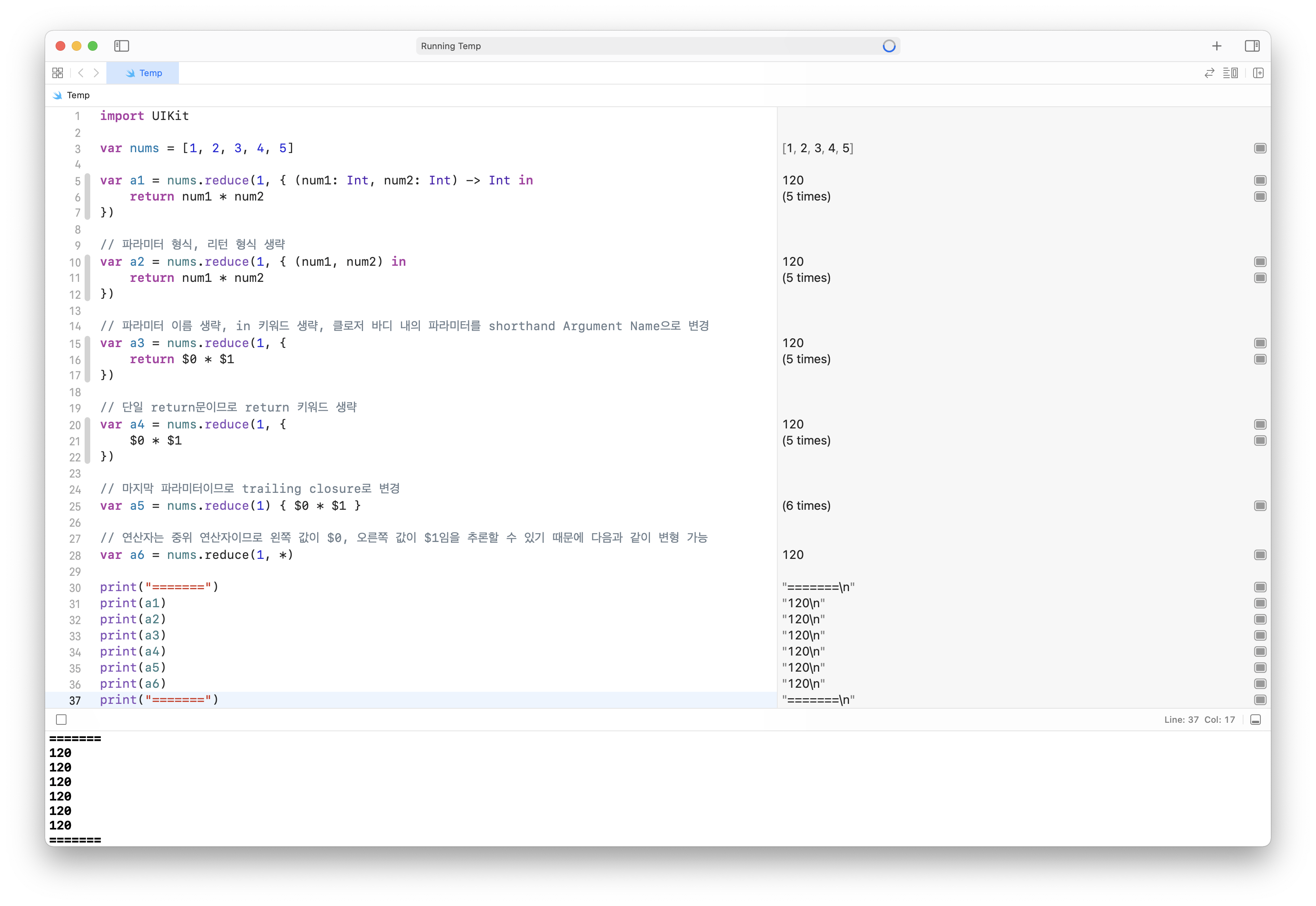 import UIKit var nums = [1, 2, 3, 4, 5] var a1 = nums.reduce(1, { (num1: Int, num2: Int) -> Int in return num1 * num2 }) // ํ๋ผ๋ฏธํฐ ํ์, ๋ฆฌํด ํ์ ์๋ต var a2 = nums.reduce(1, { (num1, num2) in return num1 * num2 }) // ํ๋ผ๋ฏธํฐ ์ด๋ฆ ์๋ต, in ํค์๋ ์๋ต, ํด๋ก์ ๋ฐ๋ ๋ด์ ํ๋ผ๋ฏธํฐ๋ฅผ shorthand Argument Name์ผ๋ก ๋ณ๊ฒฝ var a3 = nums.reduce(1, { return $0 * $1 }) // ๋จ์ผ return๋ฌธ์ด๋ฏ๋ก return ํค์๋ ์๋ต var a4 = nums.reduce(1, { $0 * $1 }) // ๋ง์ง๋ง ํ๋ผ๋ฏธํฐ์ด๋ฏ๋ก trailing closure๋ก ๋ณ๊ฒฝ var a5 = nums.reduce(1) { $0 * $1 } // ์ฐ์ฐ์๋ ์ค์ ์ฐ์ฐ์์ด๋ฏ๋ก ์ผ์ชฝ ๊ฐ์ด $0, ์ค๋ฅธ์ชฝ ๊ฐ์ด $1์์ ์ถ๋ก ํ ์ ์๊ธฐ ๋๋ฌธ์ ๋ค์๊ณผ ๊ฐ์ด ๋ณํ ๊ฐ๋ฅ var a6 = nums.reduce(1, *) print("=======") print(a1) print(a2) print(a3) print(a4) print(a5) print(a6) print("=======")reduce ์์ 2