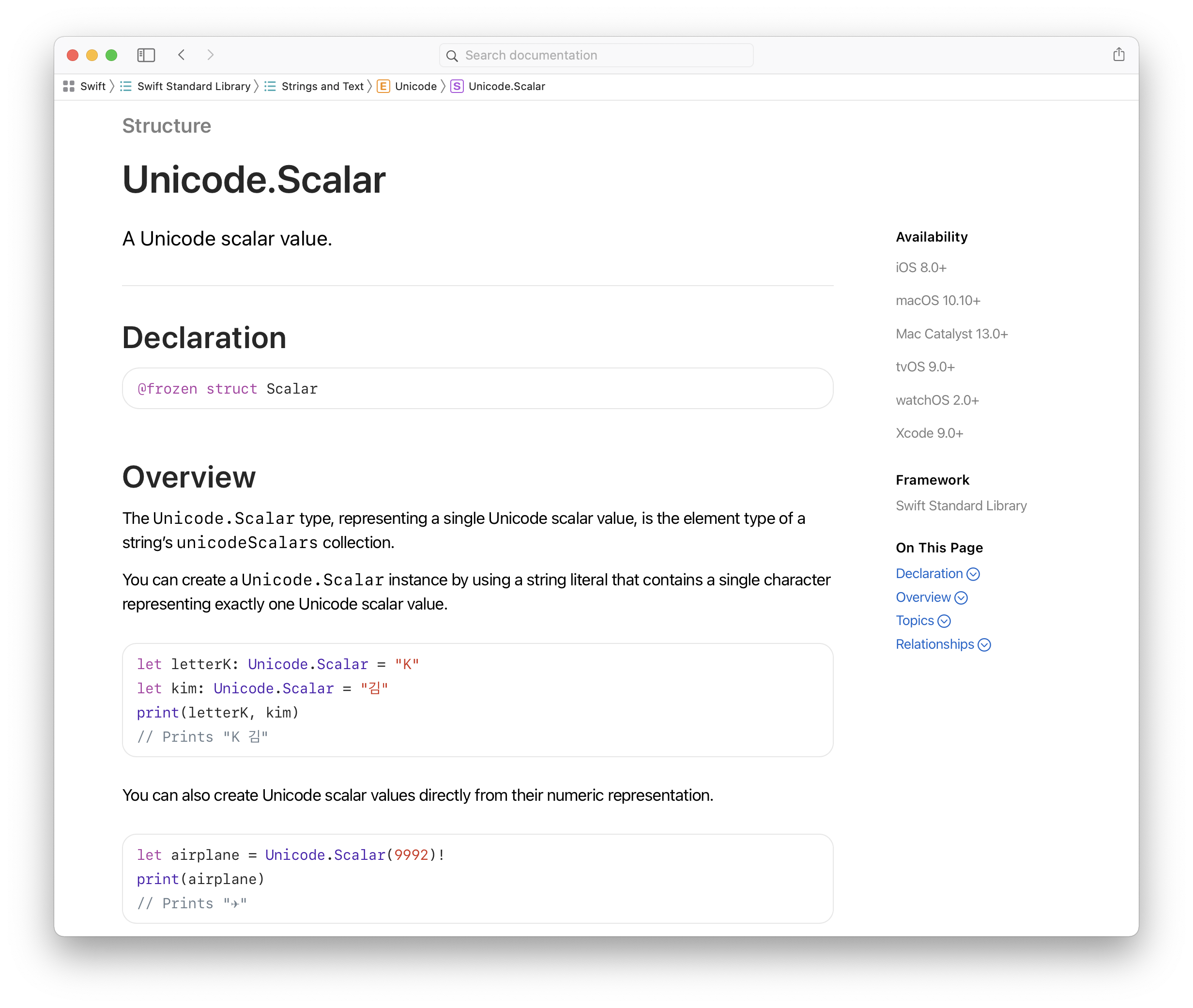 UnicodeScalar๋ Unicode.Scalar์ typealias์ธ๋ฐ, scalar ๊ฐ์ Unicode๋ฅผ ์๋ฏธํ๋ค.