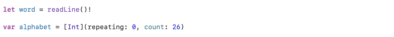 ๋จผ์ ๋ฌธ์๋ฅผ ์ ๋ ฅ ๋ฐ๊ณ , ์ํ๋ฒณ์ ์ซ์๋ฅผ ์ ๋ฐฐ์ด alphabet์ ์์ฑํ๋ค. alphabet ๋ฐฐ์ด๋ค์ ์์๋ ๋ชจ๋ 0์ผ๋ก ์ด๊ธฐํํด์ค๋ค.