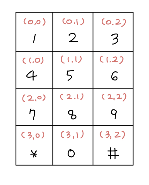 let keypad = [["1", "2", "3"], ["4", "5", "6"], ["7", "8", "9"], ["*", "0", "#"]]ํคํจ๋ ๋ฐฐ์ด์ ์๋์ ๊ฐ์ด ์ ์ฅ๋์ด์๋ค.