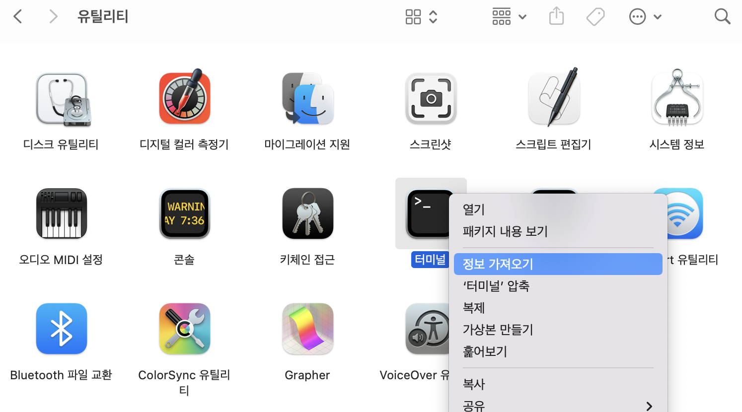 ์์ฉ ํ๋ก๊ทธ๋จ > ์ ํธ๋ฆฌํฐ๋ก ์ด๋ ํ, ํฐ๋ฏธ๋์์ ์ ๋ณด ๊ฐ์ ธ์ค๊ธฐ๋ฅผ ํด๋ฆญํ๋ค.