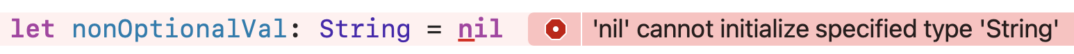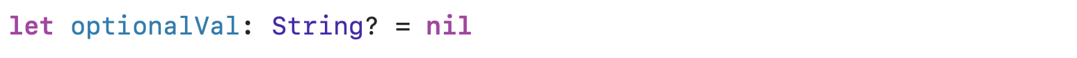 let optionalVal: String? = nil์๋ ์ฝ๋๋ Non-Optional ์ด๊ธฐ ๋๋ฌธ์ ํญ์ ๊ฐ์ ๊ฐ์ ธ์ผํ๊ณ , nil์ ์ ์ฅํ ์ ์๋ค.