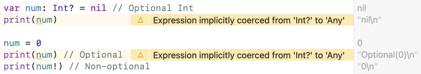 num์ 0์ ์ ์ฅํ ํ์ ์ด๋ฅผ ์ถ๋ ฅํ๋ฉด, ์ถ๋ ฅ ๊ฒฐ๊ณผ๋ Optional(0)์ด๋ค.