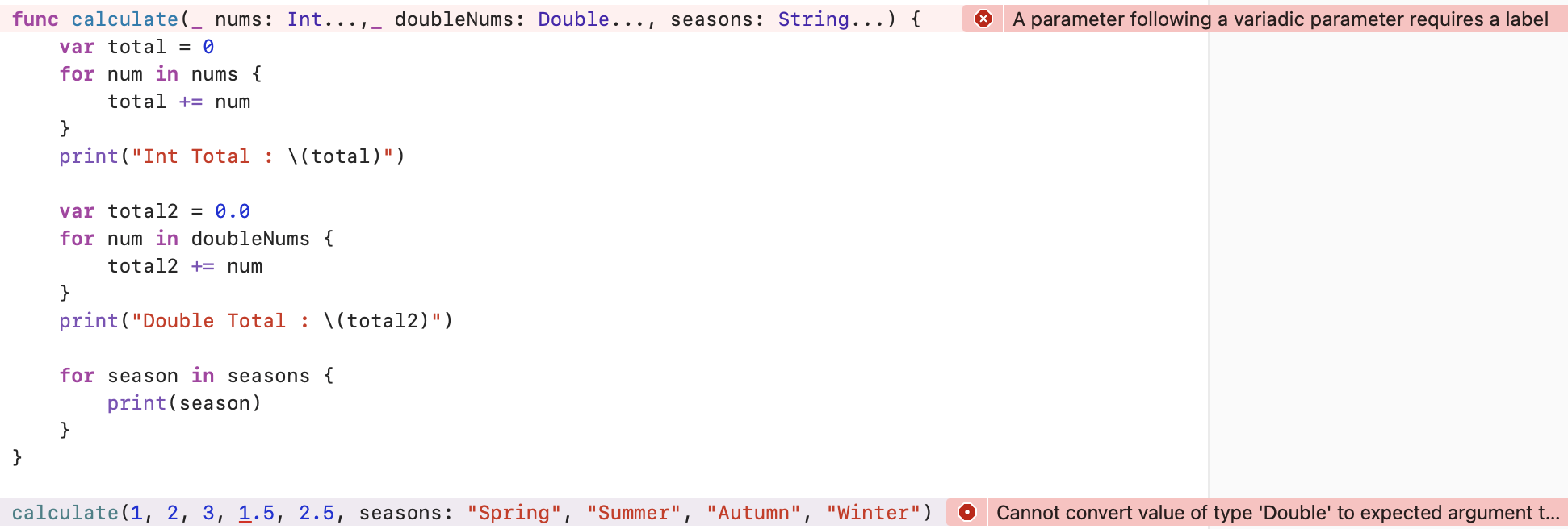 ์ฌ์ค ์ด์ ์๋ ํจ์ ๋ด์์ ๊ฐ๋ณ ํ๋ผ๋ฏธํฐ๋ฅผ 1๊ฐ๋ง ์ธ ์ ์์๋ค. ๊ทธ๋ฐ๋ฐ Swift 5.4์ Xcode 12.5๋ก ๋์ด์ค๋ฉด์, ํจ์ ๋ด์์ ์ฌ๋ฌ ๊ฐ์ ๊ฐ๋ณ ํ๋ผ๋ฏธํฐ๋ฅผ ์ธ ์ ์๊ฒ ๋์๋ค.
