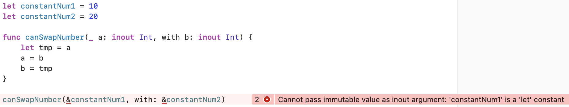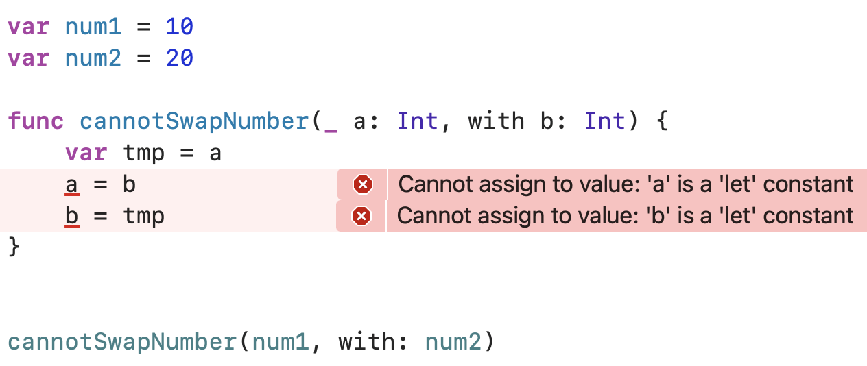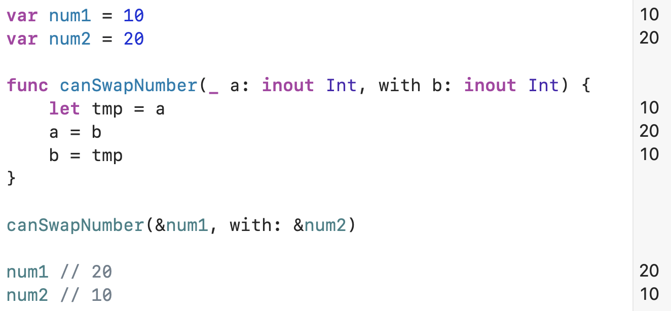 var num1 = 1 var num2 = 2 inOutFunc(&num1, &num2)์๋ ํจ์์ ํ๋ผ๋ฏธํฐ๋ ์ ์ถ๋ ฅ ํ๋ผ๋ฏธํฐ๊ฐ ์๋๊ธฐ ๋๋ฌธ์ ํ๋ผ๋ฏธํฐ๋ก ์ ๋ฌ๋ ๊ฐ์ ๋ณ๊ฒฝํ ์ ์๋ค.