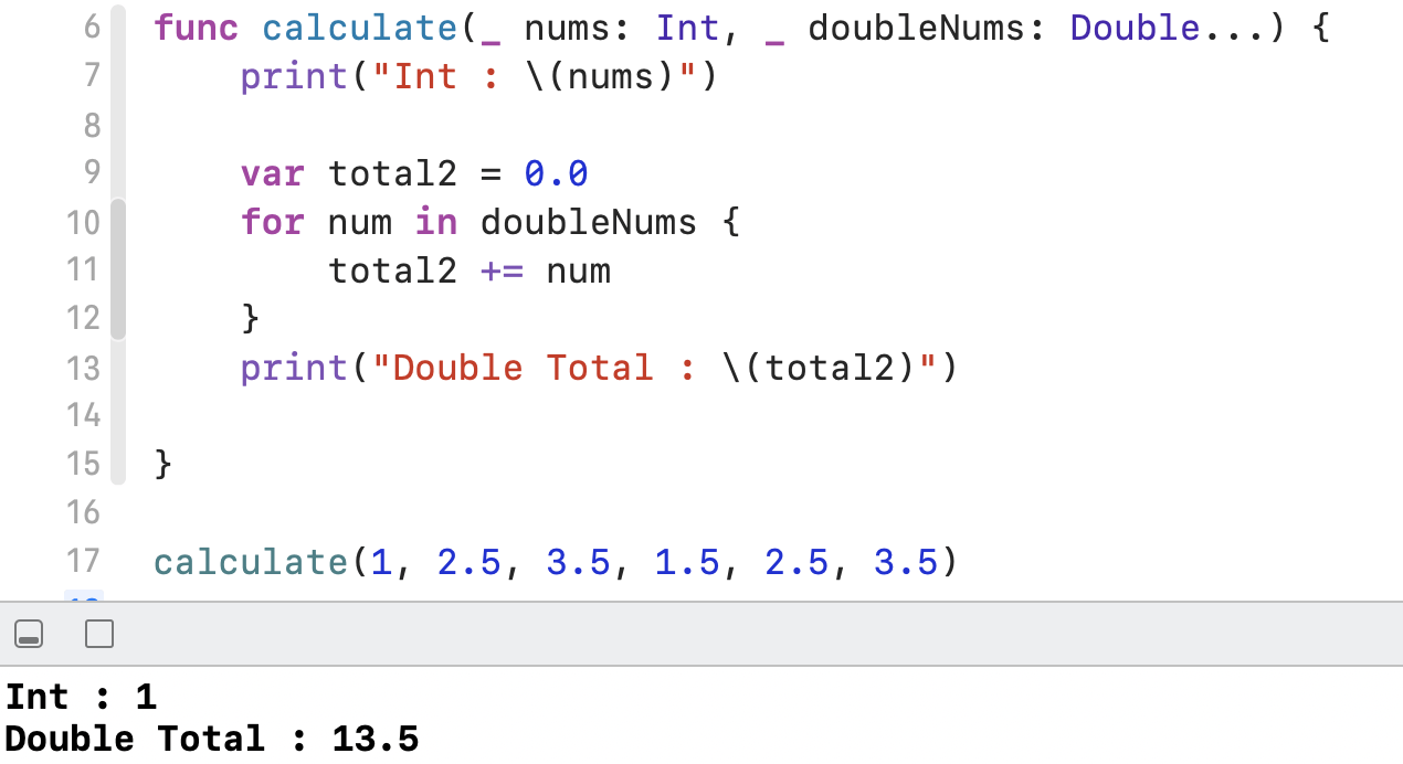 func variadicFunc(_ param: Type...) { // Code }ํ์ฌ Argument Label์ ์์ผ๋์นด๋ ํจํด์ผ๋ก ์๋ตํ๊ณ , ํ๋ผ๋ฏธํฐ param์ Type... ๋ก ๋์ด์๋ ๊ฒ์ ๋ณผ ์ ์๋ค.