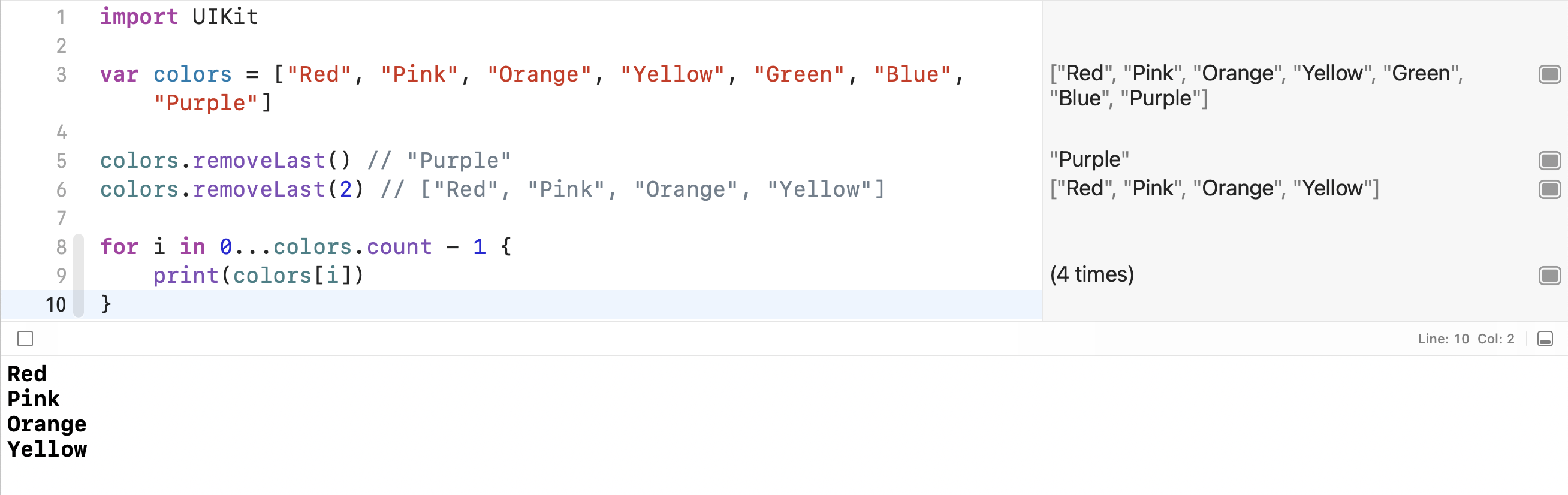 ë°°ìŽì ë§ì§ë§ ìì륌 ìì í ëìë removeLast() ë©ìë륌 ìŽì©íëë°, ë§ì§ë§ ìì륌 ìì íê³ ìì ë ììì ê°ì 늬íŽíŽì€ë€.