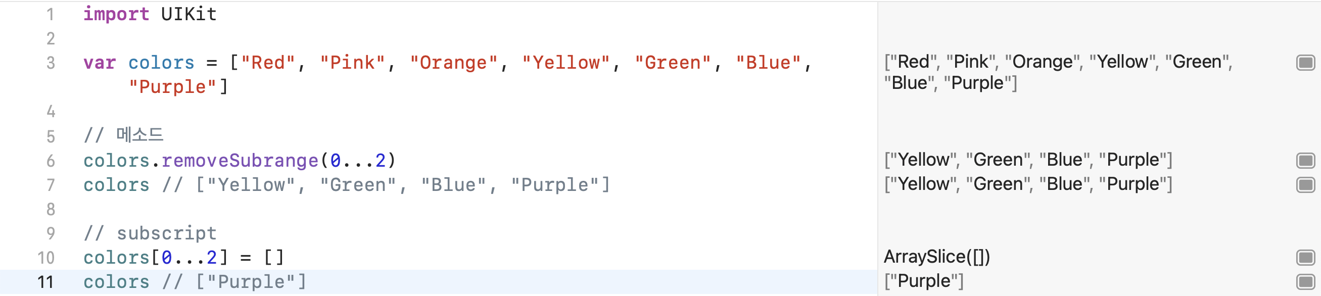 ëí í¹ì ë²ìì ë°°ìŽì ìì륌 ìì í ëìë subscript륌 ìŽì©íì¬ ìì íê³ ì íë ë²ìì ë¹ ë°°ìŽì ì ë¬íì¬ ìì íê±°ë, removeSubrange(_:) ë©ìë륌 ìŽì©íì¬ ìì í멎 ëë€.
