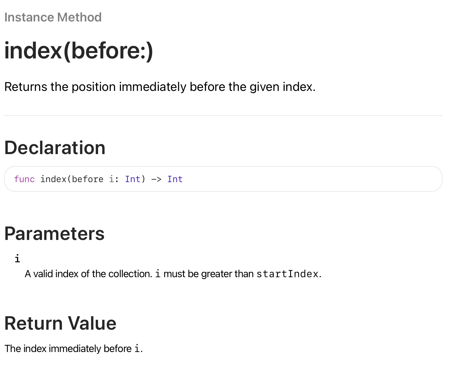 ë°ëŒì ë§ì§ë§ ììì ìžë±ì€ë¥Œ ìê³ ì¶ì 겜ì°, index(before:) ë©ìë륌 ìŽì©íŽìŒíë€.