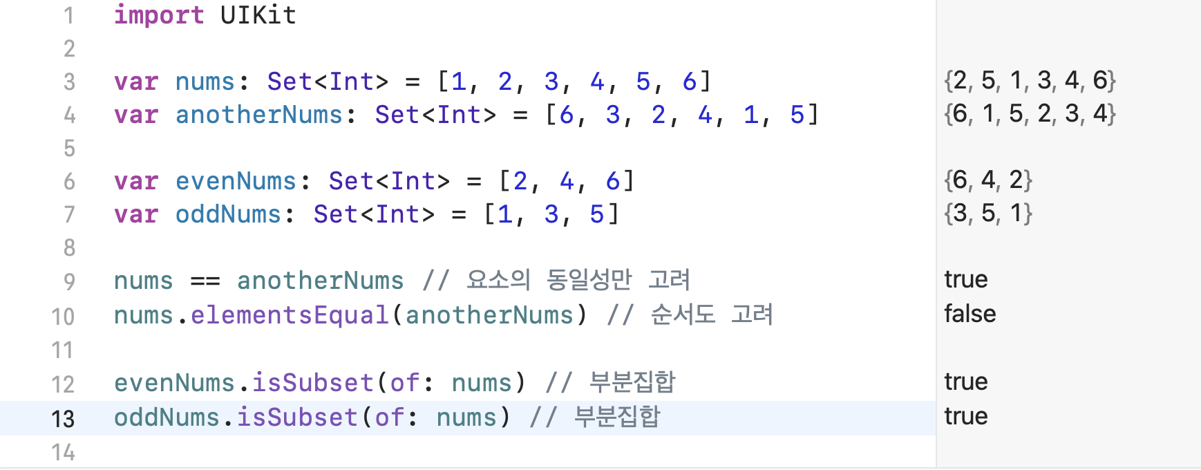 var set1: Set<String> = Set<String>() var set2: Set<String> = [] var nums: Set<Int> = [1, 2, 3, 4, 5, 6]Setì ì ìží ëìë ë°ëì Type Annotationì íŽì£ŒìŽìŒíë€. ê·žë ì§ ììŒë©Ž íì ì¶ë¡ ìì ë°°ìŽë¡ ì¶ë¡ íêž° ë묞ì 죌ìíëë¡ íì.