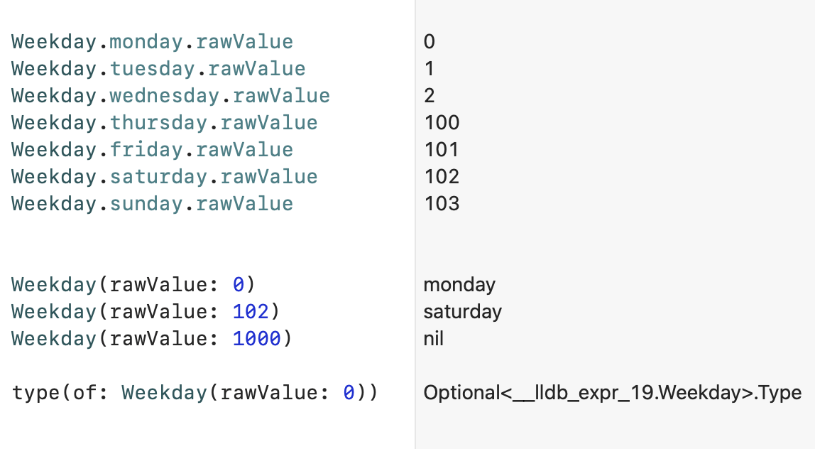 μμκ°μ μ§μ μ μ₯ν΄μ£Όμ§ μμκΈ° λλ¬Έμ, 첫λ²μ§Έ μΌμ΄μ€μΈ mondayμλ rawValueλ‘ 0μ΄, κ·Έλ¦¬κ³ μ°¨λ‘λλ‘ 1λΆν° 6κΉμ§μ κ°μ΄ μ μ₯λ κ²μ λ³Ό μ μλ€.