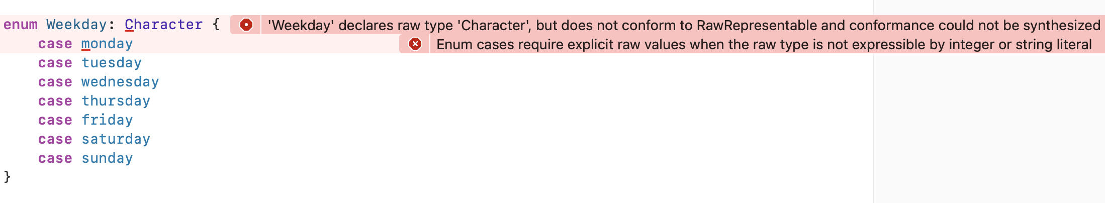 Weekday.monday Weekday.tuesday Weekday.wednesday Weekday.thursday Weekday.friday Weekday.saturday Weekday.sunday var today = Weekday.sunday today = .saturdaytodayμλ νμ¬ μ΄κ±°ν Weekdayκ° μ μ₯λμ΄μκΈ° λλ¬Έμ, μ»΄νμΌλ¬κ° todayμ μλ£νμ μκ³ μλ€.