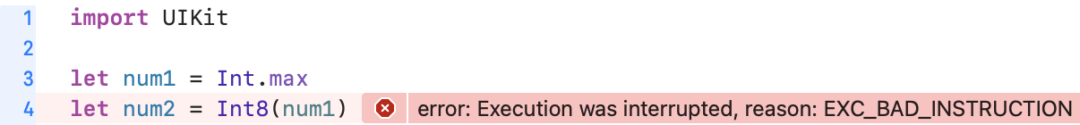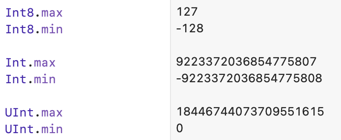 ์ฐธ๊ณ ๋ก Int8, Int, UInt์ ๊ฐ์ ์ต๋๊ฐ๊ณผ ์ต์๊ฐ์ ์๋ ์ฌ์ง๊ณผ ๊ฐ๋ค.