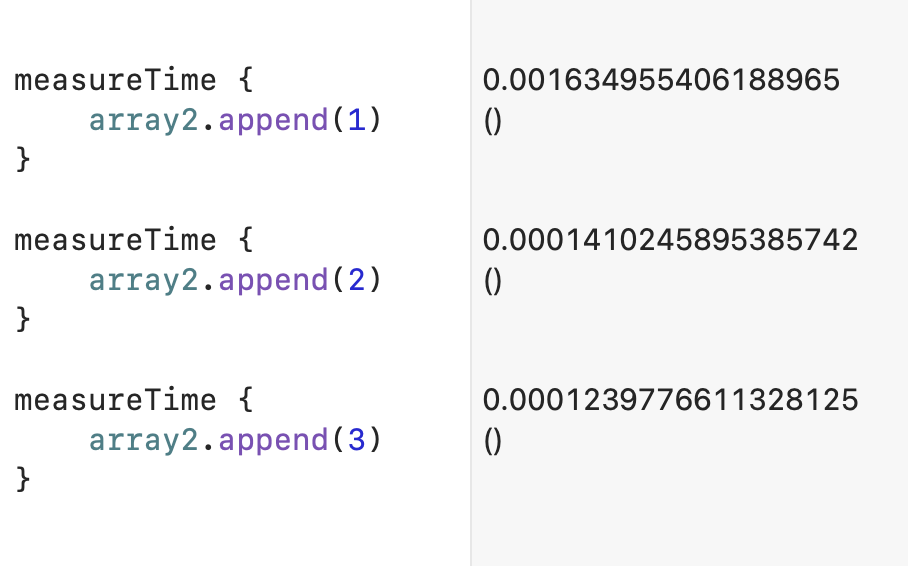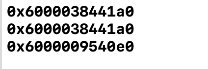 import Foundation func print(address o: UnsafeRawPointer) { print(String(format: "%p", Int(bitPattern: o))) } var array1: [Int] = [0, 1, 2, 3] var array2 = array1 // #1, array1, array2μ κ°μ ν λΉλ§ νκ³ νλ¦°νΈ print(address: array1) // 0x6000038441a0 print(address: array2) // 0x6000038441a0 // #2. array2λ₯Ό λ³κ²½νκ³ νλ¦°νΈ array2.append(1) print(address: array2) // 0x6000009540e0 // Output // 0x6000038441a0 array1 address // 0x6000038441a0 array2 address before mutation // 0x6000009540e0 array2 address after mutation#1μμλ κ°μ μ¬μ©νμ¬ array1μ μμ±νκ³ , array1μ array2μ ν λΉνλ€. μ¬κΈ°μ κ°μ Copy-on-Writeλ‘ μΈν΄ 볡μ¬κ° λμ§ μκ³ array1κ³Ό array2λ λμΌν μ£Όμλ₯Ό κ°λ¦¬ν¨λ€. νμ§λ§ #2μμ array2μ κ°μ΄ λ³κ²½λ λ κ·ΈλμμΌ λΉλ‘μ κ°μ΄ 볡μ¬λκ³ , μ€μ μ£Όμλ λ€λ₯Έ μ£Όμλ‘ λ°λ κ²μ νμΈν μ μλ€.